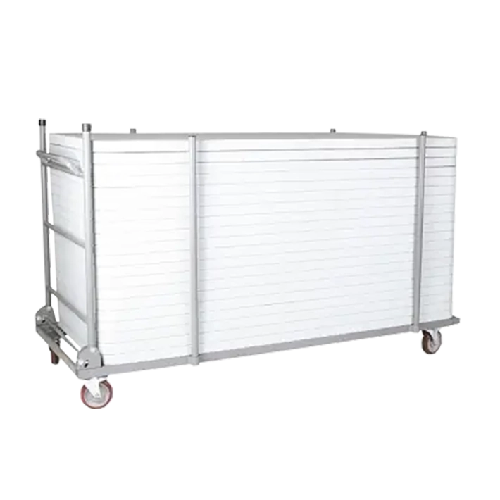 Fabricado en acero pintado en gris, una estructura de calidad para transportar de manera fácil y rápida nuestras mesas plegables. Nuestro Carro Para Mesas 200cm es perfecto para profesionales en el sector de eventos.