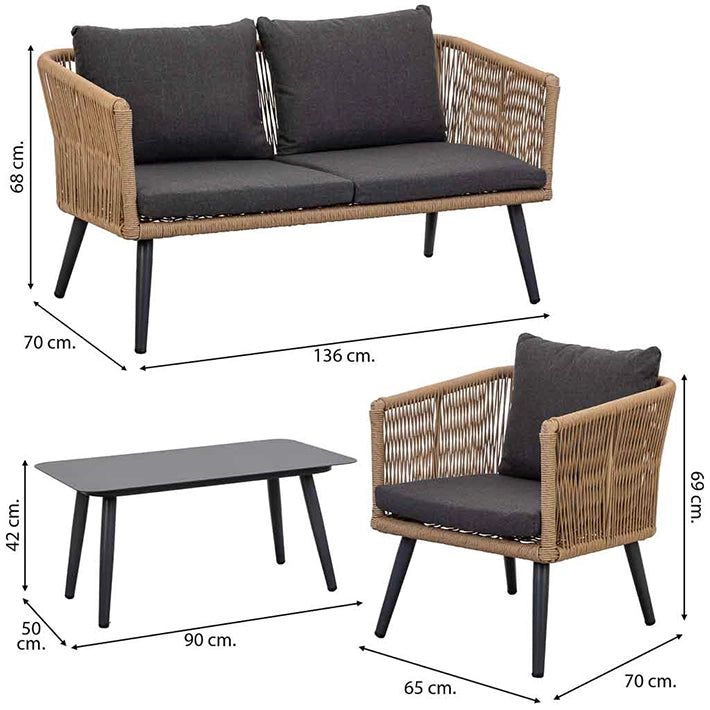 Este conjunto incluye una mesa de 90x50x42cm, dos sofás de 136x70x68cm y una silla de 65x70x69cm.