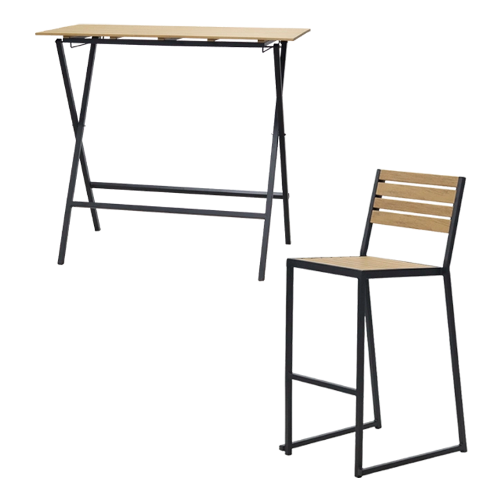 Tanto la mesa como los taburetes, están fabricados con una estructura de acero de alta calidad, apto para el uso intensivo profesional tanto en el interior como en el exterior, y el tablero, asiento y respaldo, fabricado 100% en polipropileno con un acabado que imita a la perfección el acabado de la madera.