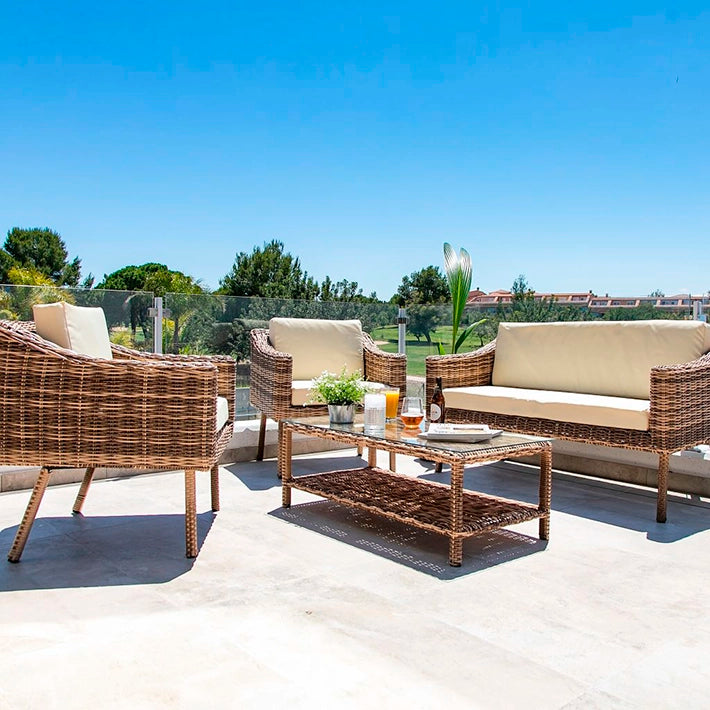 Nuestro Conjunto Ratán Sintético Trenzado Natural es un conjunto para jardín compuesto por un sofá, una mesa y dos sillones, con la estructura de acero galvanizado forrado en ratán sintético trenzado, ideal para usar en tu jardín y/o terraza.