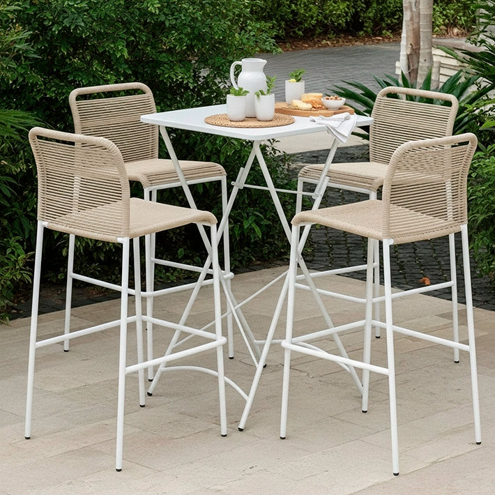 Un pack de taburetes formado por acero de alta calidad y cuerda sintética, que te va a permitir usar tanto en el interior como en el exterior de tus eventos y/o establecimiento de hostelería sin ningún tipo de problema. El Taburete Ibiza también está disponible con la estructura en color negra y verde. Diseño totalmente apilable.